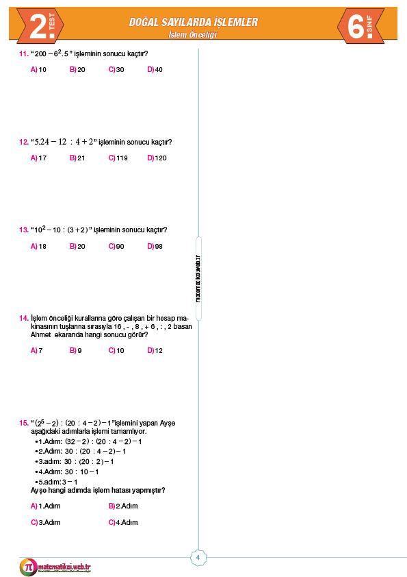 6.Sınıf İşlem Önceliği Yaprak Testi İndir