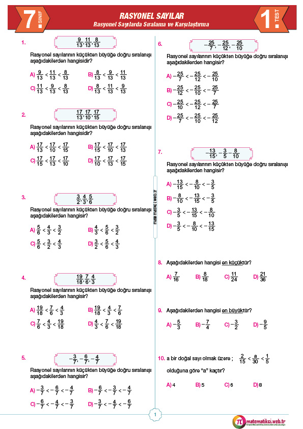 | 7.Sınıf Rasyonel Sayıları Sıralama ve Karşılaştırma Yaprak Testi İndir içeriği güncel müfredata uyumlu kazanım odaklı sorulardan oluşmaktadır.Testlerin cevap anahtarı aşağıda verilmiştir.Konuyu pekiştirmek için konu anlatımı ve online test çöz sayfalarını ziyaret etmenizi öneriyorum.. Test İçeriği: - Konu içerisinde aşağıdaki alt başlıklar vardır.