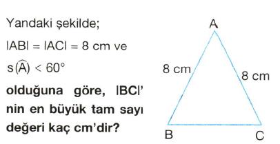 | Yukarıdaki üçgenlere göre BC kenarının alabileceği tam sayı değerlerini bulunuz. |